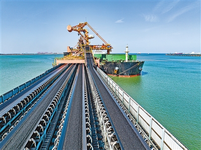 出港 河北省滄州市 在黃驊港,皮帶機將煤炭傳送到貨船上。