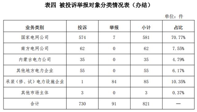 從被投訴舉報對象看,供電企業(yè)733件、占投訴舉報總數(shù)的89.28%,其中國家電網(wǎng)公司581件、占比70.77%,南方電網(wǎng)公司62件、占比7.55%,內蒙古電力公司35件、占比3.65%,其他地方電力企業(yè)55件、占比6.17%;承裝(修、試)電力設施企業(yè)85件、占比10.35%;其他市場主體3件、占比0.37%。