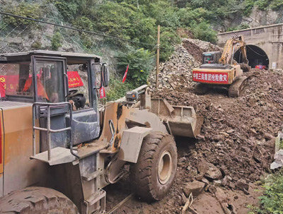 中國(guó)中鐵三局救援隊(duì)清理隧道洞口泥沙,搶修豐沙線。