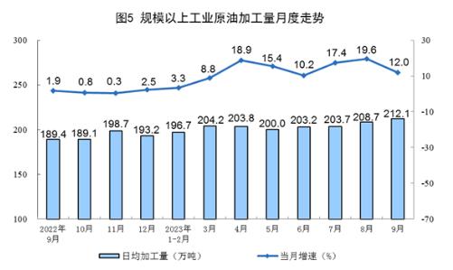 原油加工保持較快增長。9月份,加工原油6362萬噸,同比增長12.0%,增速比8月份回落7.6個百分點(diǎn),日均加工原油212.1萬噸。1—9月份,加工原油55484萬噸,同比增長11.5%。