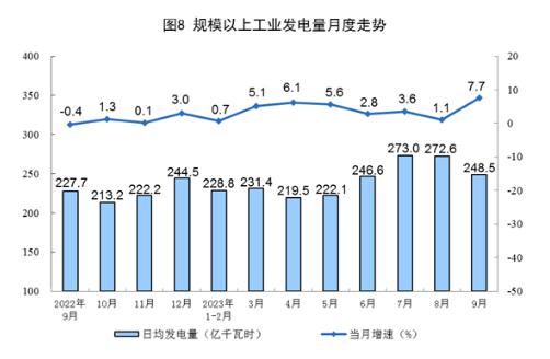 電力生產(chǎn)增速加快。9月份,發(fā)電量7456億千瓦時(shí),同比增長7.7%,增速比8月份加快6.6個百分點(diǎn),日均發(fā)電248.5億千瓦時(shí)。1—9月份,發(fā)電量66219億千瓦時(shí),同比增長4.2%。
