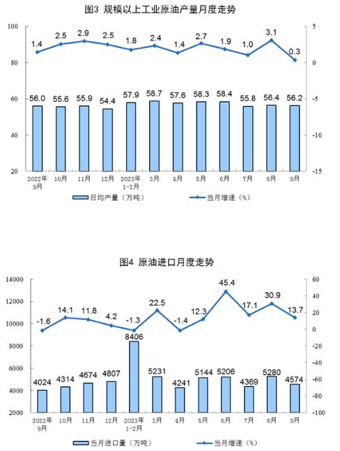 原油生產(chǎn)平穩(wěn)增長,進(jìn)口較快增長。9月份,生產(chǎn)原油1687萬噸,同比增長0.3%,增速比8月份放緩2.8個百分點(diǎn),日均產(chǎn)量56.2萬噸。進(jìn)口原油4574萬噸,同比增長13.7%,增速比8月份回落17.2個百分點(diǎn)。