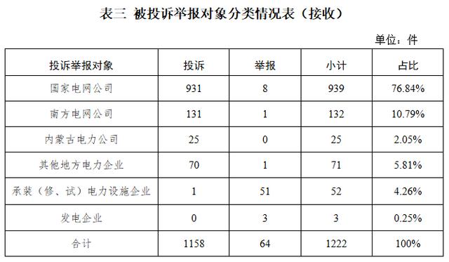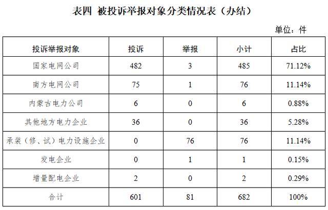從被投訴舉報(bào)對(duì)象看,供電企業(yè)603件、占投訴舉報(bào)總數(shù)的88.42%,其中:國家電網(wǎng)公司485件、占比71.12%;南方電網(wǎng)公司76件、占比11.14%;內(nèi)蒙古電力公司6件、占比0.88%;其他地方電力企業(yè)36件、占比5.28%。承裝(修、試)電力設(shè)施企業(yè)76件、占比11.14%;發(fā)電企業(yè)1件、占比0.15%;增量配電企業(yè)2件、占比0.29%。