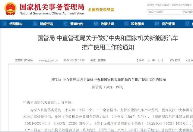 10月28日,據(jù)國(guó)家機(jī)關(guān)事務(wù)管理局網(wǎng)站消息,國(guó)管局、中直管理局日前聯(lián)合印發(fā)《關(guān)于做好中央和國(guó)家機(jī)關(guān)新能源汽車(chē)推廣使用工作的通知》,旨在支持新能源汽車(chē)產(chǎn)業(yè)發(fā)展,更好發(fā)揮中央和國(guó)家機(jī)關(guān)示范引領(lǐng)作用。