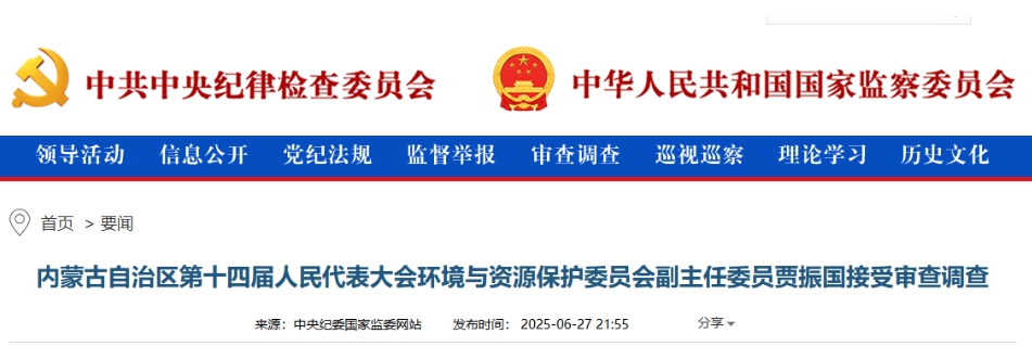 中央紀(jì)委國家監(jiān)委網(wǎng)站6月27日消息,據(jù)內(nèi)蒙古自治區(qū)紀(jì)委監(jiān)委消息:內(nèi)蒙古自治區(qū)第十四屆人民代表大會環(huán)境與資源保護委員會副主任委員賈振國涉嫌嚴(yán)重違紀(jì)違法,目前正接受內(nèi)蒙古自治區(qū)紀(jì)委監(jiān)委紀(jì)律審查和監(jiān)察調(diào)查。