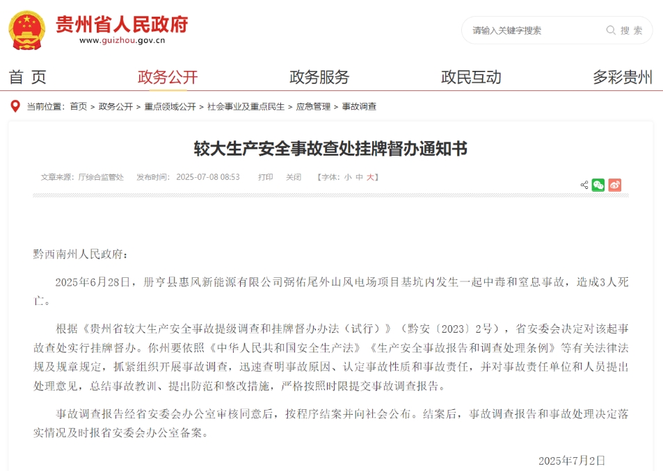 2025年6月28日,冊亨縣惠風(fēng)新能源有限公司弼佑尾外山風(fēng)電場項(xiàng)目基坑內(nèi)發(fā)生一起中毒和窒息事故,造成3人死亡。