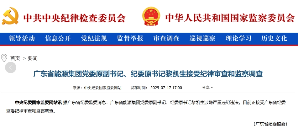 中央紀(jì)委國家監(jiān)委網(wǎng)站7月17日消息,據(jù)廣東省紀(jì)委監(jiān)委消息:廣東省能源集團(tuán)黨委原副書記、紀(jì)委原書記黎凱生涉嫌嚴(yán)重違紀(jì)違法,目前正接受廣東省紀(jì)委監(jiān)委紀(jì)律審查和監(jiān)察調(diào)查。