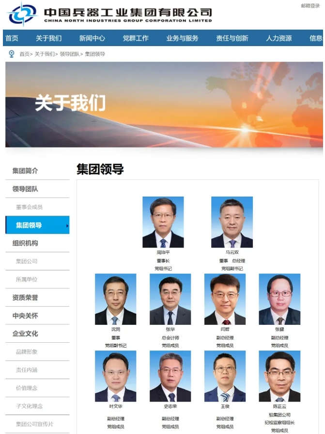 中國兵器工業(yè)集團有限公司官網(wǎng)“集團領導”一欄最新信息顯示,沈