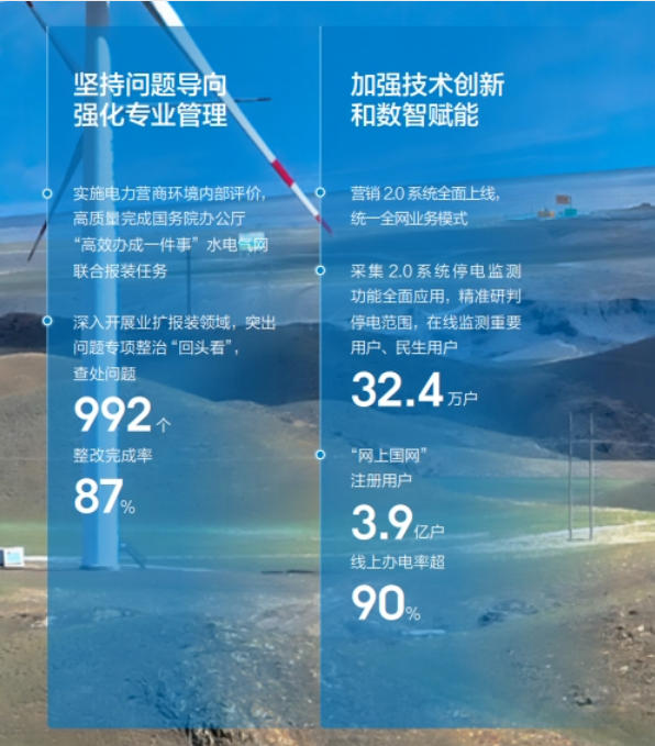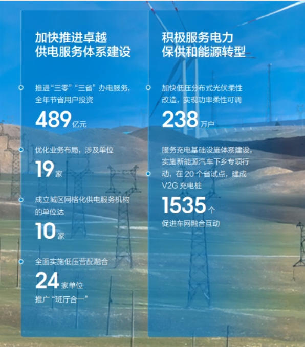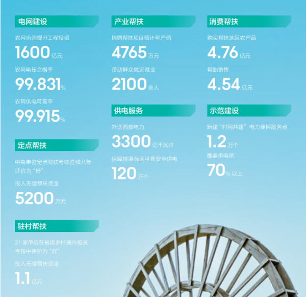 農網(wǎng)鞏固提升工程投資1600億元,農網(wǎng)電壓合格率99.831%,農網(wǎng)供電可靠率99.915%;捐贈幫扶項目預計年產值4765萬元,帶動群眾就近就業(yè)2100余人;投入無償幫扶資金1.1億元。