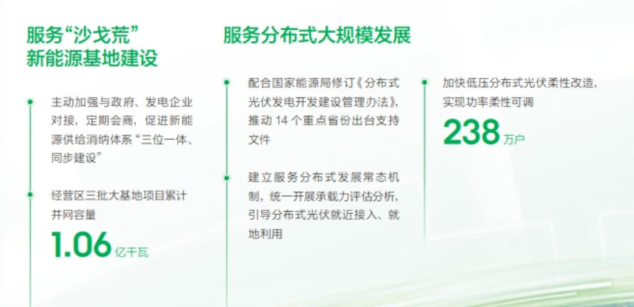 促進新能源高質量發(fā)展,經(jīng)營區(qū)三批大基地項目累計并網(wǎng)容量1.06億千瓦;加快低壓分布式光伏柔性改造,實現(xiàn)功率柔性可調238萬戶;全年風光新能源裝機容量新增2.7億千瓦,同比增長16.5%;風光新能源發(fā)電量占比19.3%,利用率96.1%;開工抽水蓄能電站5座,建成投運抽水蓄能機組23臺,在運裝機容量累計達到4056萬千瓦;經(jīng)營區(qū)新型儲能達到5876萬千瓦。