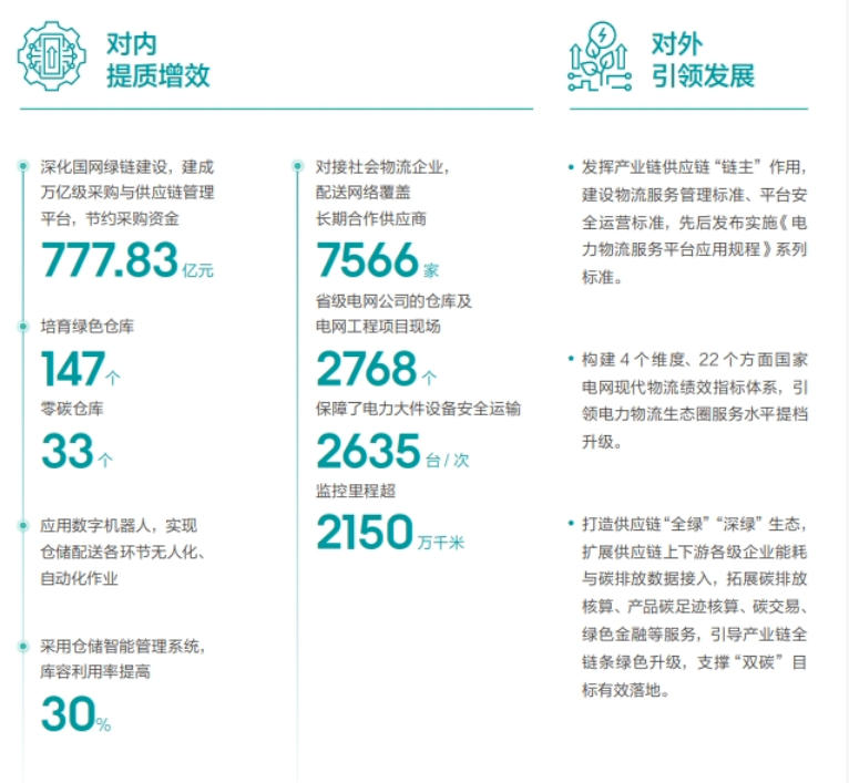 打造綠色數(shù)智供應鏈,對內深化國網(wǎng)綠鏈建設,建成萬億級采購與供應鏈管理平臺,節(jié)約采購資金777.83億元;對外構建4個維度、22個方面國家電網(wǎng)現(xiàn)代物流績效指標體系,引領電力物流生態(tài)圈服務水平提檔升級。