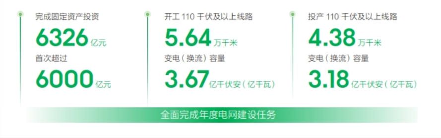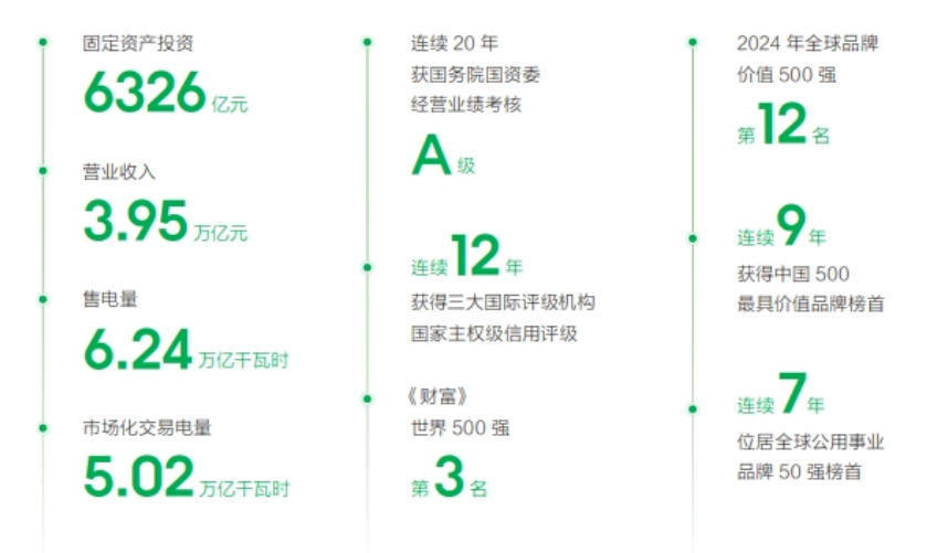 2024年完成固定資產投資6326億元,達成營業(yè)收入3.95萬億元;全年售電量6.24萬億千瓦時,市場化交易電量5.02萬億千瓦時;并網(wǎng)發(fā)電裝機容量26.3億千瓦,其中風光新能源并網(wǎng)裝機容量11.4億千瓦;累計建成特高壓工程“22交16直”38項,跨區(qū)跨省輸電能力3.4億千瓦,建成全球技術水平最高、配置資源能力最強、并網(wǎng)裝機規(guī)模最大、安全運行時間最長的交直流混聯(lián)特大型電網(wǎng)。