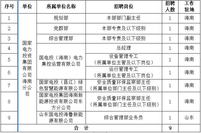 詳見《國家電力投資集團有限公司海南分公司所屬單位招聘崗位職責(zé)及任職條件》(附件1)。