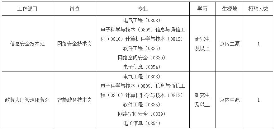 1.信息安全技術(shù)處:網(wǎng)絡(luò)安全技術(shù)崗工作人員1名(京內(nèi)生源研究生及以上應(yīng)屆畢業(yè)生)。專業(yè)為電氣工程(0808)、電子科學(xué)與技術(shù)(0809)、信息與通信工程(0810)、計算機(jī)科學(xué)與技術(shù)(0812)、軟件工程(0835)、網(wǎng)絡(luò)空間安全(0839)、電子信息(0854)。要求熟悉網(wǎng)絡(luò)安全和數(shù)據(jù)安全防護(hù)技術(shù)、法律法規(guī)和管理知識,作風(fēng)正派、嚴(yán)謹(jǐn)細(xì)致、踏實肯干,責(zé)任心強(qiáng)、執(zhí)行力強(qiáng)、服務(wù)意識強(qiáng),具有較強(qiáng)的溝通協(xié)調(diào)能力和文字功底。