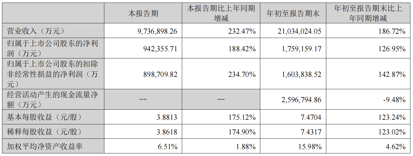 歸屬上市公司股東凈利潤突破94億元,較上年同期增長188.42%,而今年上半年累計(jì)81.68億元,創(chuàng)下寧德時(shí)代單季度歸母凈利潤歷史新高。