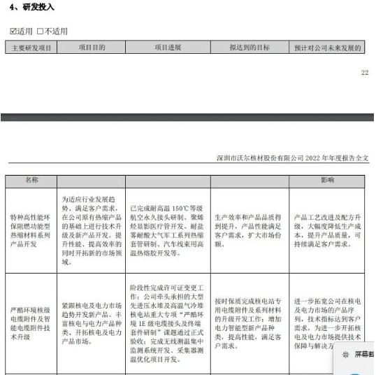 主要研發(fā)項目包括特種高性能環(huán)保阻燃功能型熱縮材料系列產(chǎn)品開發(fā)項目、嚴酷環(huán)境核級電纜附件及智能電纜附件技術升級項目。具體見下表。