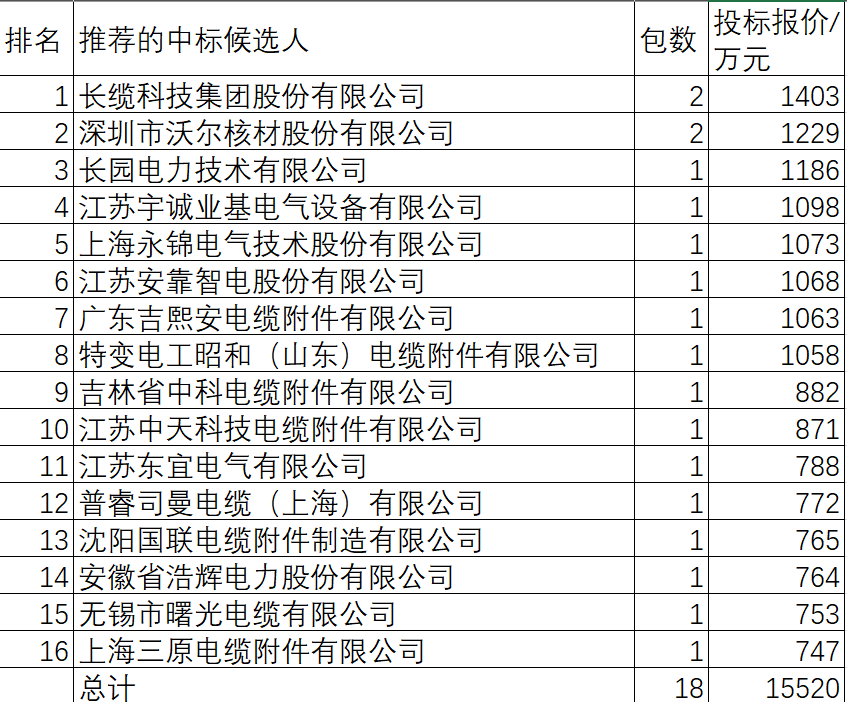 長纜科技、沃爾核材中標2包,其余供應(yīng)商中標1包。中標金額分布較為均衡,10家過800萬元,8家過1000萬元,長纜科技最高,1403萬元,三原電纜附件最低,747萬元。具體情況如下:第1的長纜科技集團股份有限公司中2包1403萬元,占總金額的9.0%。第2的深圳市沃爾核材股份有限公司中2包1229萬元,占總金額的7.9%。