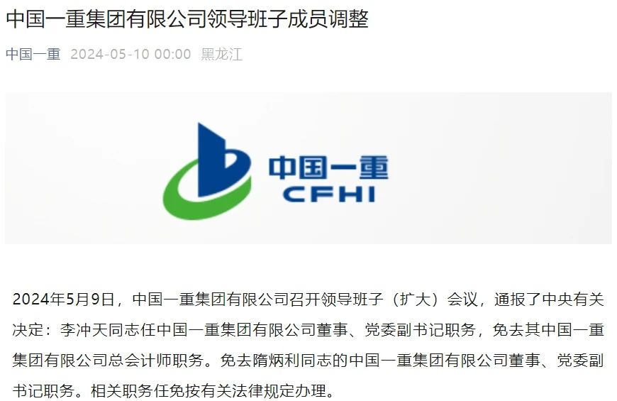 中國(guó)一重集團(tuán)有限公司領(lǐng)導(dǎo)班子成員調(diào)整