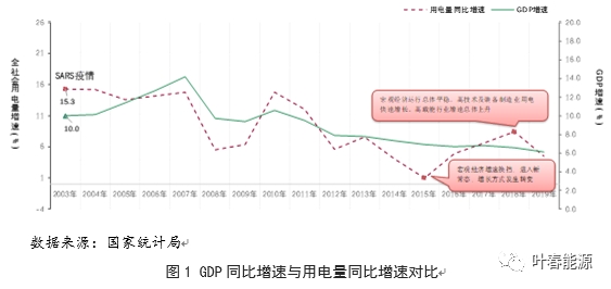 用電量與GDP增速具有較強(qiáng)的相關(guān)性。從GDP與用電量增速對比曲線圖可以看出,2003-2019年二者用電量走勢基本一致。2015年和2018年二者有些背離,一方面是經(jīng)濟(jì)增速進(jìn)入換擋期,動力轉(zhuǎn)換;另一方面是二者統(tǒng)計(jì)指標(biāo)調(diào)整時間上有些不一致。