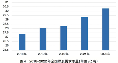 近五年來,全國煤炭消費總量隨著GDP增長同步逐年上升,2022年預計達到30.3億噸標準煤(見圖4)。
