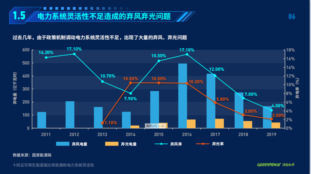 目前,中國以煤電為主的電力系統(tǒng)靈活性嚴(yán)重不足,電力系統(tǒng)的僵化導(dǎo)致了棄風(fēng)、棄光問題的出現(xiàn)。2011-2019年,中國的棄風(fēng)和棄光率一度高達(dá)17.1%和10.5%,造成了大量發(fā)電資源的浪費(fèi)。2016-2018年間,中國棄風(fēng)和棄光電量共計1389億千瓦時 ,相當(dāng)于約3000萬千瓦煤電廠的發(fā)電量。