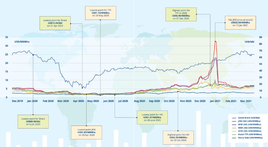受疫情影響,2020年全球油氣供需嚴(yán)重失調(diào),不僅WTI創(chuàng)造了歷史性的“負(fù)油價(jià)”,全球天然氣價(jià)格也緊隨其后,降至近十年來(lái)最低點(diǎn)。一直飽受“亞洲溢價(jià)”困擾的JKM定價(jià)與同期歐美氣價(jià)幾乎持平,最低至1.83美元/MMBtu。