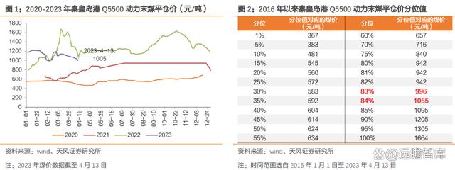 近期煤價(jià)持續(xù)回落,但仍處于歷史較高分位。2023 年 4 月 13 日秦皇島 Q5500 動(dòng)力末煤平倉(cāng)價(jià)為 1005 元/噸,較年內(nèi) 1 月份高點(diǎn)(1215 元/噸)下降 17.28%,較 2022 年以來(lái)峰值(1664元/噸)已回落 39.60%。歷史對(duì)比來(lái)看,當(dāng)前秦皇島 Q5500 動(dòng)力末煤平倉(cāng)價(jià)位于 2016 年以來(lái)的 83%~84%分位高點(diǎn),仍處于歷史高位。