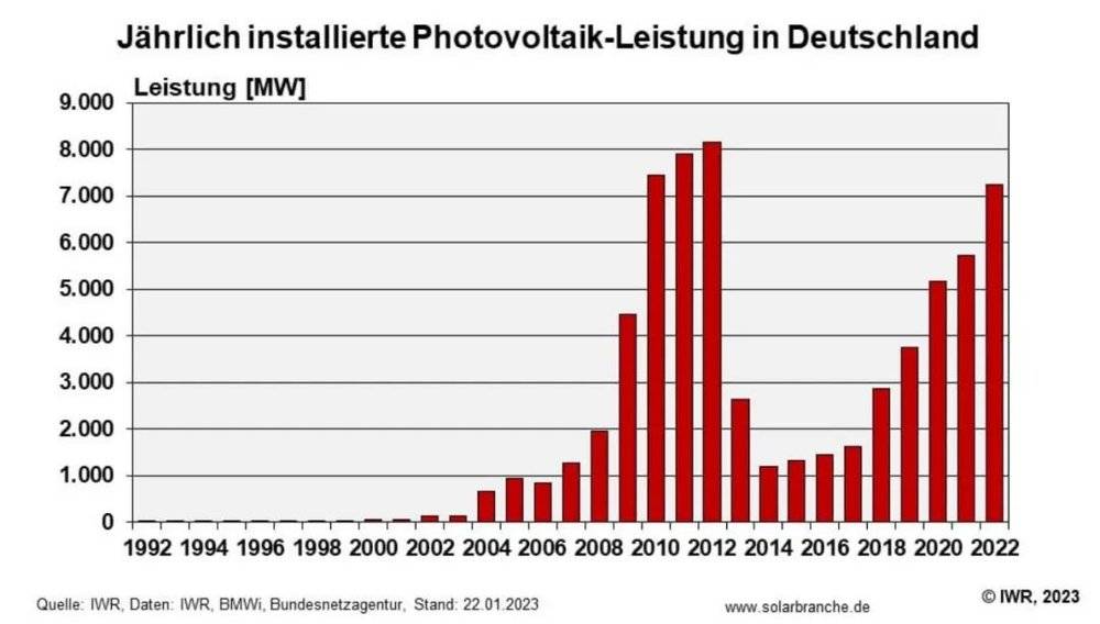 根據(jù)德國經(jīng)濟(jì)與能源部的測算,到2030年光伏發(fā)電總量必須從60GW增加到200GW以上,德國的能源轉(zhuǎn)型才能成功。根據(jù)這一目標(biāo),德國在未來8年內(nèi)每年要安裝超過17GW,而2021年和2022年這一數(shù)字僅為5.46GW和7.18GW。