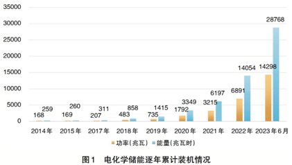 近年來(lái),電化學(xué)儲(chǔ)能呈現(xiàn)爆發(fā)式增長(zhǎng),根據(jù)《統(tǒng)計(jì)數(shù)據(jù)》,2023年上半年,新增投運(yùn)電化學(xué)儲(chǔ)能電站227座、總功率7.41吉瓦、總能量14.71吉瓦時(shí),新增規(guī)模創(chuàng)歷史新高,超過(guò)此前歷年累計(jì)裝機(jī)規(guī)模總和(見(jiàn)圖1)。此外,目前在建電化學(xué)儲(chǔ)能電站325座、總功率12.92吉瓦、總能量30.49吉瓦時(shí),按照電化學(xué)儲(chǔ)能電站建設(shè)周期一般6~8個(gè)月計(jì)算,在不計(jì)新增項(xiàng)目的情況下,2023年下半年新增裝機(jī)規(guī)模也將翻一番,提前兩年完成“十四五”規(guī)劃裝機(jī)目標(biāo)(國(guó)家發(fā)改委、國(guó)家能源局《關(guān)于加快推動(dòng)新型儲(chǔ)能發(fā)展的指導(dǎo)意見(jiàn)》中提到,2025年新型儲(chǔ)能裝機(jī)規(guī)模達(dá)3000萬(wàn)千瓦以上)。