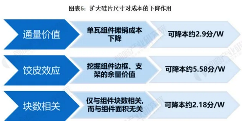 隨著硅片尺寸的擴大,新型組件可以通過增加少量的硅片成本,獲得更高的組件端成本節(jié)約,進而提升大尺寸組件的產(chǎn)品競爭力。其降本機理為: