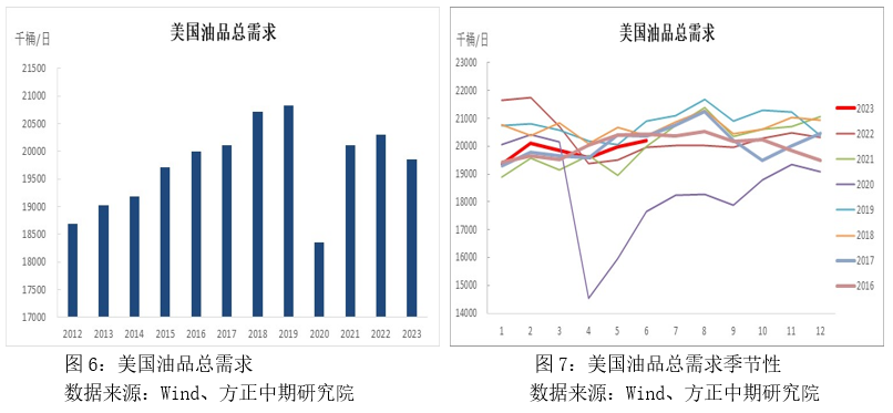 近幾年,受疫情以及美聯(lián)儲(chǔ)持續(xù)加息影響,美國(guó)經(jīng)濟(jì)整體呈現(xiàn)下行趨勢(shì),進(jìn)而對(duì)美國(guó)石油消費(fèi)形成明顯打擊,尤其是2020年疫情爆發(fā),美國(guó)石油消費(fèi)在2020年二季度出現(xiàn)驟降,2021-2022年有一定回升,但2023年上半年美國(guó)石油消費(fèi)并未能延續(xù)前兩年的增長(zhǎng)趨勢(shì),且整體低于疫情前水平。