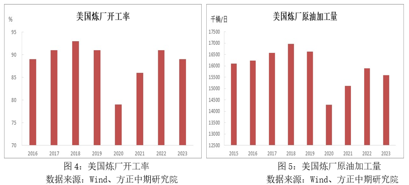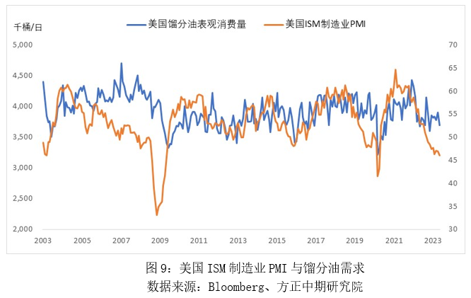 美國(guó)柴油消費(fèi)與美國(guó)制造業(yè)形勢(shì)息息相關(guān),通過對(duì)比發(fā)現(xiàn),美國(guó)餾分油需求與美國(guó)ISM制造業(yè)PMI趨勢(shì)基本保持一致,但存在滯后關(guān)系。其中,2008年金融危機(jī)以及2020年疫情均導(dǎo)致美國(guó)制造業(yè)PMI大幅下滑,并帶動(dòng)美國(guó)餾分油需求明顯走弱,但2021年美國(guó)制造業(yè)再度進(jìn)入下行周期,2022年美國(guó)餾分油需求也開始走弱,2023年美國(guó)餾分油消費(fèi)量達(dá)到381萬桶/日,較2022年下降了10萬桶/日,較2019年下降了26萬桶/日,降幅為6.5%。從歷史數(shù)據(jù)來看,排除極端情況,美國(guó)制造業(yè)變化往往要領(lǐng)先于美國(guó)餾分油需求變化近1年時(shí)間。