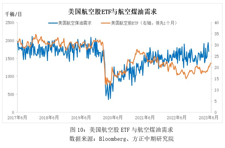 美國(guó)航空煤油消費(fèi)與美國(guó)航空業(yè)景氣度有緊密聯(lián)系。美國(guó)航空股ETF一定程度上能反應(yīng)美國(guó)航空業(yè)景氣度,2020年疫情導(dǎo)致航空出行需求驟降,美國(guó)航空業(yè)遭遇重挫,航空股ETF大幅走跌,相應(yīng)的,美國(guó)航空煤油消費(fèi)也顯著下降,而隨著美國(guó)出行限制的逐步放松,美國(guó)航空業(yè)景氣度也在逐步回升,進(jìn)而帶動(dòng)美國(guó)航空煤油快速回升,但2021年二季度以后,受經(jīng)濟(jì)環(huán)境低迷影響,美國(guó)航空股ETF再度走跌,直至2022年9月份才觸底回升,而在過去1年,美國(guó)航空煤油消費(fèi)整體也隨著美國(guó)航空業(yè)的進(jìn)一步恢復(fù)而走強(qiáng)。另外,我們從OAG的數(shù)據(jù)來看,當(dāng)前美國(guó)航空運(yùn)力已經(jīng)超過2019年同期水平約16%,同時(shí)2023年上半年美國(guó)航空實(shí)際客運(yùn)量也已經(jīng)回到疫情前水平,這對(duì)美國(guó)航空煤油消費(fèi)形成明顯支撐。2023年上半年美國(guó)航空煤油消費(fèi)量達(dá)到158萬桶/日,較2022年小幅增長(zhǎng)了3萬桶/日,但較2019年下降了20萬桶/日,降幅為11%。