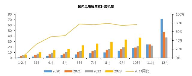 根據(jù)最新10月風(fēng)電裝機(jī)數(shù)據(jù),2023年1-10月,國內(nèi)新增風(fēng)電裝機(jī)37.31GW,同比增長76%,單10月新增裝機(jī)達(dá)到3.83GW,同比增長102%,環(huán)比下降16%??梢钥闯鰺o論單月裝機(jī)量還是累計規(guī)模都要遠(yuǎn)優(yōu)于去年,側(cè)面印證國內(nèi)風(fēng)電可能迎來了拐點(diǎn)。