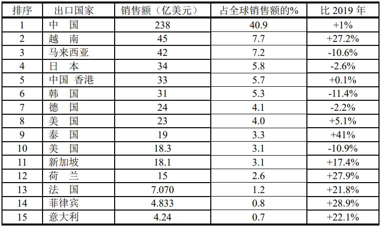 太陽能發(fā)電產(chǎn)品的五大出口國依次是中國、越南、馬來西亞、日本和中國香港。按價(jià)值計(jì)算,這五個(gè)主要出口國在2020年出口了大約三分之二(67.3%)的太陽能產(chǎn)品。
