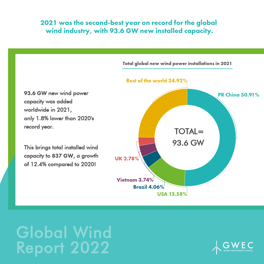 全球風能理事會GWEC日前發(fā)布了《2022年全球風電行業(yè)報告》:2021年是全球新冠疫情的第二年,風電行業(yè)依然實現(xiàn)了近94 GW的新增并網裝機,為歷史第二好成績。相比于2020年,全球風電新增裝機量僅下降了1.8%。