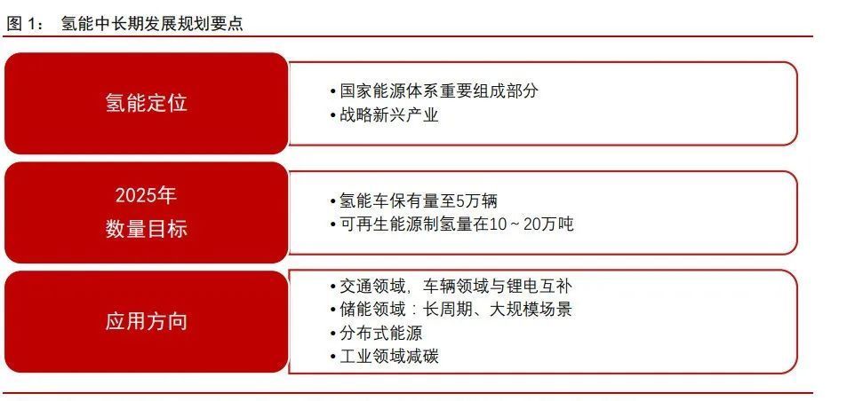 國(guó)家發(fā)改委2022年3月23日發(fā)布《氫能產(chǎn)業(yè)發(fā)展中長(zhǎng)期規(guī)劃(2021-2035)》(簡(jiǎn)稱“行業(yè)中長(zhǎng)期規(guī)劃”),體現(xiàn)出政策對(duì)未來(lái)氫能產(chǎn)業(yè)的發(fā)展定位,也明確了政策鼓勵(lì)的應(yīng)用場(chǎng)景和領(lǐng)域,勾勒出氫能中長(zhǎng)期藍(lán)圖,有助于強(qiáng)化投資者對(duì)氫能產(chǎn)業(yè)發(fā)展信心,提振產(chǎn)業(yè)參與者的長(zhǎng)期預(yù)期。行業(yè)中長(zhǎng)期規(guī)劃對(duì)投資而言主要有三大核心要點(diǎn),包括氫能定位、未來(lái)發(fā)展目標(biāo)以及應(yīng)用方向。在產(chǎn)業(yè)定位中,氫能被正式確定能源,且是能源體系的重要組成部分,此外氫能產(chǎn)業(yè)鏈相關(guān)環(huán)節(jié)也被納入國(guó)家戰(zhàn)略新興產(chǎn)業(yè)的范疇。相關(guān)的量化發(fā)展目標(biāo)主要對(duì)應(yīng)2025年的目標(biāo),一大目標(biāo)是氫能車保有量達(dá)到5萬(wàn)輛,另一目標(biāo)是可再生能源制氫量在10~20萬(wàn)噸。對(duì)于未來(lái)的應(yīng)用方向,政策規(guī)劃了包括交通、儲(chǔ)能、分布式能源以及工業(yè)領(lǐng)域的減碳四大領(lǐng)域。