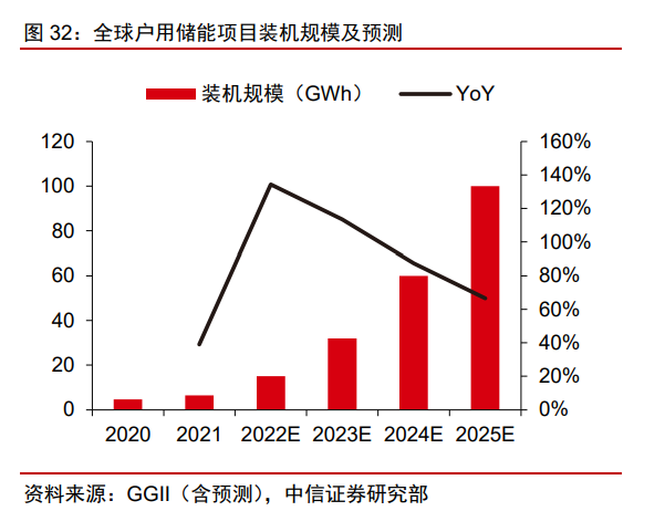 電價(jià)攀升+能源危機(jī),推動(dòng)歐洲戶(hù)儲(chǔ)項(xiàng)目經(jīng)濟(jì)性和配置意愿持續(xù)高漲。歐洲電價(jià)在近 年來(lái)天然氣價(jià)格大幅上漲情況下持續(xù)攀升,推動(dòng)戶(hù)用光伏+儲(chǔ)能項(xiàng)目經(jīng)濟(jì)性顯著增強(qiáng)。據(jù) BNEF 統(tǒng)計(jì),2021 年歐洲戶(hù)儲(chǔ)項(xiàng)目新增規(guī)模達(dá) 1.04GW/2.05GWh(+56%/+73% YoY)。 而 2022 年俄烏沖突進(jìn)一步推升歐洲能源成本行至高位,且能源危機(jī)背景下歐洲居民配套 光儲(chǔ)系統(tǒng)積極性空前高漲,儲(chǔ)能滲透率快速提升,為未來(lái)幾年戶(hù)儲(chǔ)行業(yè)奠定高景氣基調(diào)。 在以歐洲為主要戶(hù)儲(chǔ)市場(chǎng)的高增長(zhǎng)支撐下,GGII 預(yù)計(jì)全球戶(hù)儲(chǔ)市場(chǎng)容量將由 2021 年的 6.4GWh 大幅增至 2025 年的 100GWh。