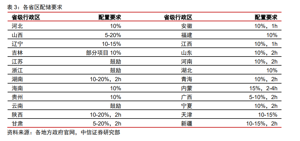 各地區(qū)逐步明確風(fēng)光配儲(chǔ)要求,推動(dòng)發(fā)電側(cè)儲(chǔ)能發(fā)展。隨著國(guó)家多部委的儲(chǔ)能政策出 臺(tái)和持續(xù)細(xì)化,各地方政府也在積極響應(yīng)和明確新增發(fā)電項(xiàng)目的強(qiáng)制性配儲(chǔ)要求,配儲(chǔ)比 例在 5%-10%,配儲(chǔ)時(shí)長(zhǎng)為 2-4 小時(shí)。除少數(shù)省份為部分項(xiàng)目配儲(chǔ)和鼓勵(lì)性配儲(chǔ)要求之外, 90%以上的地區(qū)都提出強(qiáng)制性配儲(chǔ)要求?,F(xiàn)實(shí)需求和政策推動(dòng)是未來(lái)幾年國(guó)內(nèi)儲(chǔ)能裝機(jī)的 主要驅(qū)動(dòng)因素。