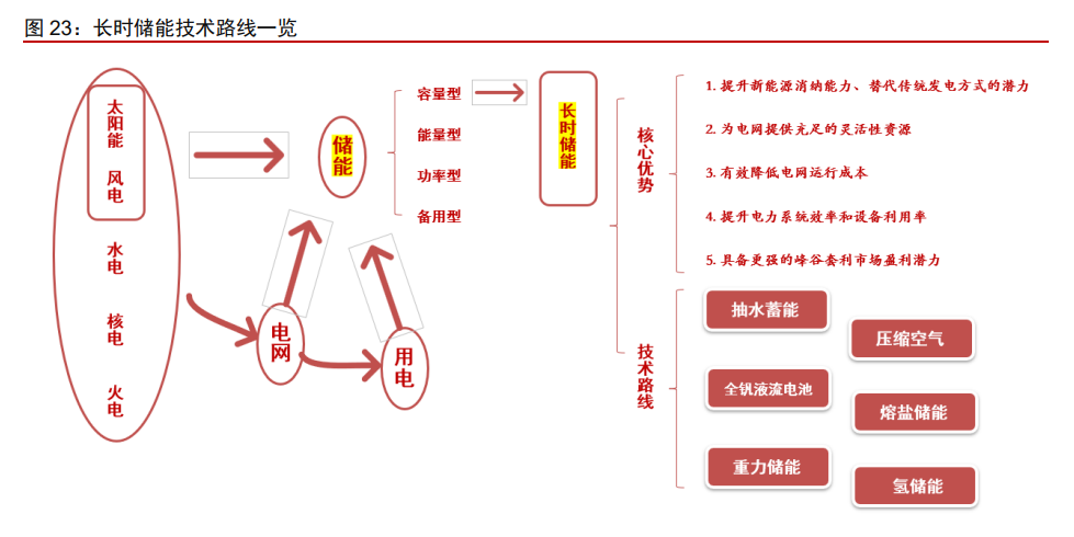 新能源滲透率快速提升,疊加其出力的不穩(wěn)定性,推升儲(chǔ)能市場(chǎng)需求,電力系統(tǒng)的儲(chǔ) 能應(yīng)用存在多種時(shí)間尺度需求,長(zhǎng)時(shí)儲(chǔ)能(一般指 4h 以上)成為儲(chǔ)能發(fā)展的重要方向, 在電力系統(tǒng)中具備多種優(yōu)勢(shì)——長(zhǎng)時(shí)儲(chǔ)能具備提升新能源消納能力、替代傳統(tǒng)發(fā)電方式的 潛力,可以為電網(wǎng)提供充足的靈活性資源,可有效降低電網(wǎng)運(yùn)行成本,具備更強(qiáng)的峰谷套 利和市場(chǎng)盈利潛力。