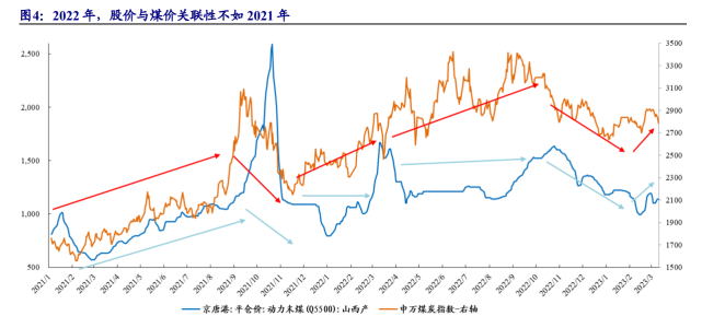2021-2022:2021年疫后需求恢復(fù),GDP增速提升至8.4%,“十三五”期間去產(chǎn)能致供給不足,煤炭價格持續(xù)上漲,股價持續(xù)上漲。煤價由2021年初的600元/噸左右,到2021年10月的2000元/噸以上,股價亦由年初的1600點左右上漲到年末的2500點左右。2022年,俄烏沖突加速海外能源危機,碳中和預(yù)期影響未來煤炭新批產(chǎn)能及煤企新建產(chǎn)能意愿,煤價高位震蕩,股價總體上漲。2022年煤價在1200元/噸高位震蕩,股價波動上漲,由年初的2400點上漲到10月的3200點左右。