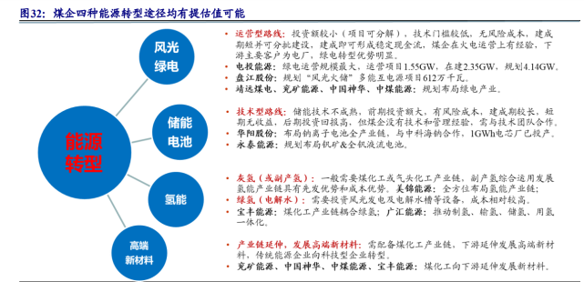 (1)風(fēng)光綠電。風(fēng)光綠電轉(zhuǎn)型為運(yùn)營(yíng)型轉(zhuǎn)型路線,是煤企能源轉(zhuǎn)型的主要路徑之一,該路徑具有投資額較小、項(xiàng)目可分解、技術(shù)門檻相對(duì)較低、風(fēng)險(xiǎn)成本低等特點(diǎn)。風(fēng)光綠電建成期短并可分批建設(shè),建成即能形成穩(wěn)定的現(xiàn)金流。由于大部分煤企具有坑口火電廠,煤炭下游客戶主要為電廠,煤企具有一定的電力運(yùn)營(yíng)能力,風(fēng)光綠電轉(zhuǎn)型具有明顯優(yōu)勢(shì),是煤企轉(zhuǎn)型初期的主要路徑。電投能源:上市煤企中風(fēng)光綠電運(yùn)營(yíng)規(guī)模最大,運(yùn)營(yíng)項(xiàng)目1.55GW,在建2.35GW,規(guī)劃4.14GW。盤江股份:規(guī)劃發(fā)展風(fēng)電、光伏、火電、抽水蓄能項(xiàng)目612萬(wàn)千瓦,“風(fēng)光火儲(chǔ)”多能互補(bǔ),前景廣闊。靖遠(yuǎn)煤電、兗礦能源、中國(guó)神華、中煤能源:規(guī)劃布局綠電產(chǎn)業(yè)。