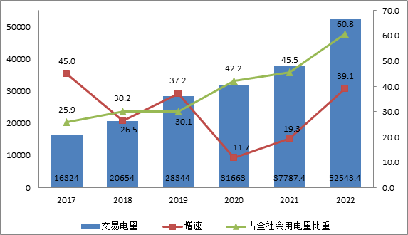 按交易結(jié)算口徑統(tǒng)計,2022年全國市場交易電量共5.25萬億千瓦時,同比增長39%,占全社會用電量比重達60.8%,同比提高15.4個百分點。其中,跨省跨區(qū)市場化交易電量首次超1萬億千瓦時,同比增長近50%。2022年國家電網(wǎng)經(jīng)營區(qū)域市場交易電量達4.16萬億千瓦時,同比增長42.7%;南方電網(wǎng)經(jīng)營區(qū)域市場交易電量0.85萬億千瓦時,同比增長27.4%;內(nèi)蒙古電網(wǎng)經(jīng)營區(qū)域市場交易電量0.24萬億千瓦時,同比增長24.9%。在電力交易機構(gòu)注冊的市場主體數(shù)量首次超過60萬家,同比增長29%。