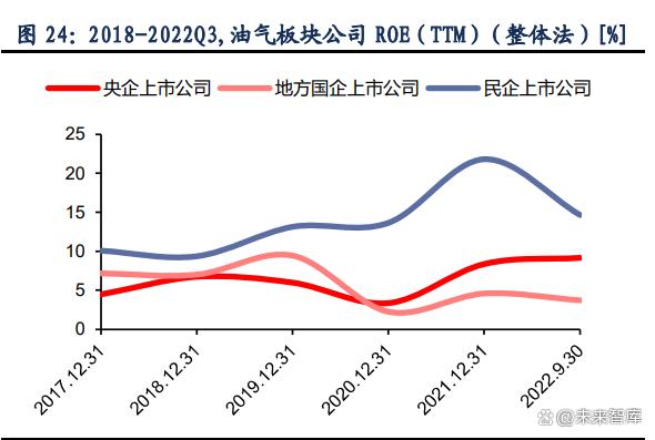 油氣板塊 ROE 數(shù)據(jù)方面,與煤炭,電力板塊不同,油氣民企上市公司總體高于央企和地方 國企,我們認為,這主要是由于以“三桶油”為代表的央國企的煉油主業(yè)毛利率較低,主要 服務(wù)于國家戰(zhàn)略;而民企公司主業(yè)以大煉化為主,經(jīng)營效率更高,成本更低。根據(jù) 2022 年 三季報,SW 油氣煉化工程板塊,ROE(整體法)為 1.19%;而 SW 煉油化工板塊,ROE (整體法)則為 9.82%。在 PB 估值方面,央企公司顯著低于地方國企和民企,甚至部分處 于破凈狀態(tài),在未來估值重塑方面或有更大空間。