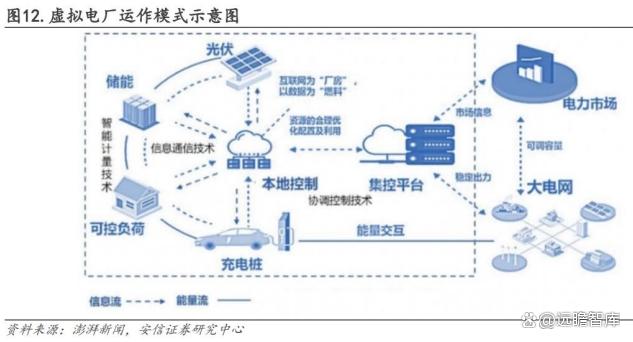 未來(lái)隨著電力市場(chǎng)成熟,工商業(yè)儲(chǔ)能也可以通過(guò)虛擬電廠以聚合的方式參與電力市場(chǎng)交易。虛擬電廠是應(yīng)用先進(jìn)的通訊和控制技術(shù),實(shí)現(xiàn)對(duì)大量散布的分布式資源的聚合調(diào)控,使這些分布式資源規(guī)?;⒕邆鋮⑴c電力系統(tǒng)運(yùn)行調(diào)度的資格和能力。“虛擬”的含義是這些資源并非真正的發(fā)電廠,而是對(duì)分布式資源的聚合,“電廠”的含義是能夠像真正的發(fā)電廠一樣為電力系統(tǒng)提供電能量和輔助服務(wù)。