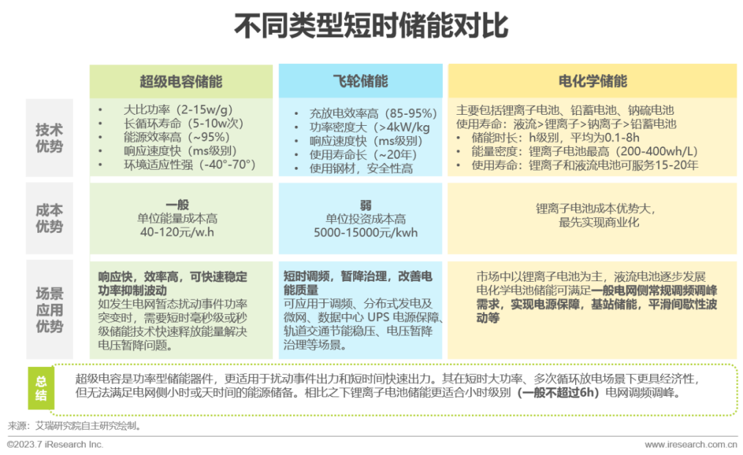 儲(chǔ)能系統(tǒng)配套各類發(fā)電機(jī)組參與發(fā)電/電網(wǎng)和用戶側(cè)調(diào)頻調(diào)峰已逐步進(jìn)入的商業(yè)化階段。(中)短時(shí)儲(chǔ)能一般以功率型和能量型為主。主要有超級(jí)電容儲(chǔ)能、飛輪儲(chǔ)能、各類電化學(xué)儲(chǔ)能。不同場景下儲(chǔ)能的需求痛點(diǎn)不同,(中)短時(shí)儲(chǔ)能中毫秒和秒級(jí)技術(shù)更側(cè)重解決應(yīng)急調(diào)頻,瞬間功率調(diào)節(jié)。小時(shí)級(jí)別(通常<10h)例如電化學(xué)儲(chǔ)能多應(yīng)用于平滑出力波動(dòng),緩解調(diào)峰壓力等,飛輪儲(chǔ)能適用于大功率、響應(yīng)快、高頻次的場景,典型市場包括UPS、軌道交通、電網(wǎng)快速大容量調(diào)頻。