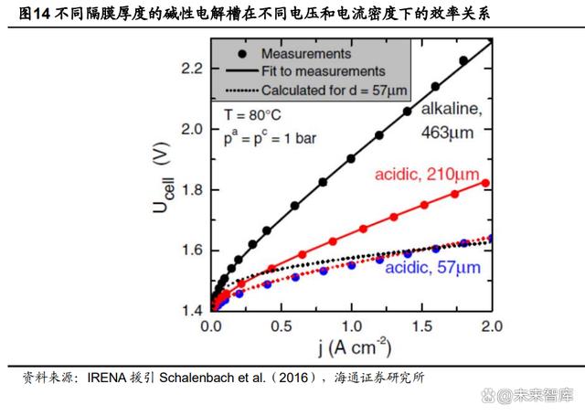 減小隔膜厚度:可以提高效率并減少電力消耗。隔膜越薄,將 OH-從陰極運(yùn)輸 到陽極的阻力就越低,但由于氣體滲透水平較高,從而可能導(dǎo)致安全問題。另 一個(gè)缺點(diǎn)是耐久性較低,因?yàn)楦裟ぶ懈锌赡軙?huì)形成針孔,導(dǎo)致機(jī)械魯棒性降 低??傮w而言,堿性電解槽的隔膜厚度應(yīng)該接近 PEM 槽和 AEM 槽的水平。對(duì) 于 PEM 來說,目前最先進(jìn)的膜厚度為 125-175 μm,并有潛力降低到 20 μm。 ALK 目前的隔膜厚度為 460 μm,將其降低到 50 μm 可以使堿槽在 1A/cm2 下 的效率從 53%提升到 75%。