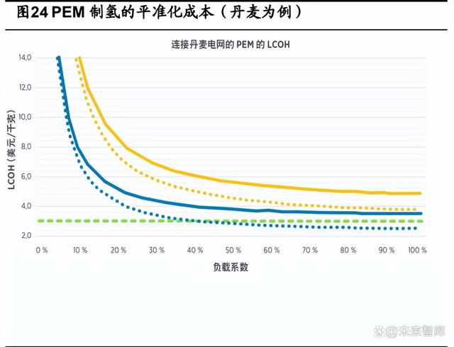 PEM 技術(shù)可通過為電網(wǎng)提供額外的輔助性服務(wù),以降低成本。由于 PEM 技術(shù)提供 更寬廣的工作范圍并且響應(yīng)時(shí)間更短,可以在不折損其可用生產(chǎn)能力的情況下,提供高 價(jià)值頻率控制備用容量,從而適應(yīng)可再生能源(VRE)的生產(chǎn)波動(dòng)性,為不同的電力市 場提供靈活性服務(wù)獲得收入。這種靈活性可以提高電力制氫的整體經(jīng)濟(jì)效益,推動(dòng) PEM 平準(zhǔn)化成本(LCOH)的降低。以丹麥綠氫生產(chǎn)的 LCOH 為例,連接電網(wǎng)的 PEM 電解 裝臵相較 ALK 基本具備競爭力。