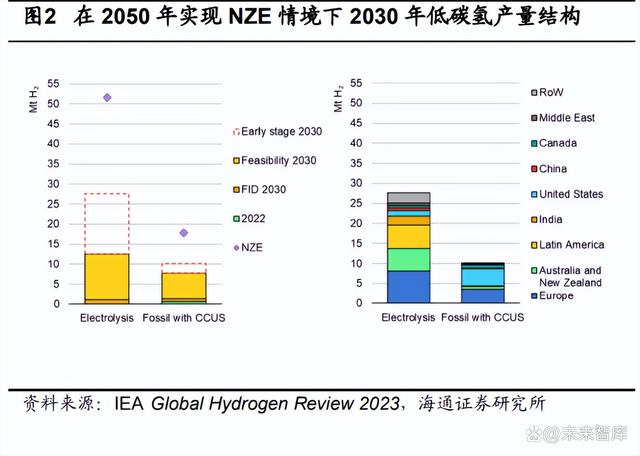 綠氫方面,歐洲、澳大利亞、美國受政策推動(dòng)發(fā)展較為積極,拉美、非洲也有所布 局。根據(jù)國際能源署《全球氫能回顧 2023》,目前已宣布的低碳?xì)漤?xiàng)目多數(shù)為電解氫的 綠氫項(xiàng)目,到 2030 年 70%以上的低碳?xì)渖a(chǎn)可來自電解氫。分區(qū)域來看,歐洲地區(qū)發(fā) 展較為積極的為西班牙、丹麥、德國和荷蘭,合計(jì)占?xì)W洲綠氫總產(chǎn)量的 55%,主要受 IPCEI 項(xiàng)目和歐洲氫能銀行的推動(dòng);澳大利亞依靠豐富的風(fēng)光資源,到 2030 年綠氫產(chǎn)量有望 達(dá) 600 萬噸,并且有望實(shí)現(xiàn)綠氫出口;拉美地區(qū)已宣布的項(xiàng)目到 2030 年綠氫產(chǎn)量也有 望達(dá) 600 萬噸,其中主要集中在智利、巴西和阿根廷;美國主要受益于清潔氫生產(chǎn)的稅 收抵免(Clean Hydrogen Production Tax Credit),至 23 年 9 月的前 12 個(gè)月宣布的電 解槽項(xiàng)目產(chǎn)能達(dá) 9GW;中國方面,已宣布項(xiàng)目正在積極建設(shè)落地(約占總規(guī)劃產(chǎn)量的 40%);非洲地區(qū),已宣布項(xiàng)目到 2030 年綠氫產(chǎn)量有望達(dá) 200 萬噸,主要集中在肯尼 亞、毛里求斯、摩洛哥、納米比亞和南非,已有 9 個(gè)項(xiàng)目規(guī)劃產(chǎn)能超過 1GW。 藍(lán)氫方面,美國和歐洲(英國、荷蘭和挪威)為藍(lán)氫的主產(chǎn)地。根據(jù) IEA 統(tǒng)計(jì)的現(xiàn) 已宣布的項(xiàng)目預(yù)測(cè),到 2030 年美國藍(lán)氫產(chǎn)量有望達(dá)到 400 萬噸,歐洲有望達(dá) 300 萬噸, 主要產(chǎn)地為英國、荷蘭和挪威。