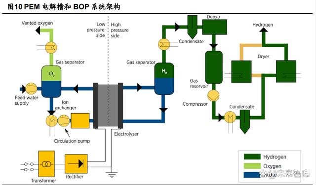 電源和雙極板為 PEM 電解槽系統(tǒng)未來實(shí)現(xiàn)成本下降的重點(diǎn)。結(jié)合 PEM 電解槽系統(tǒng) 成本下降潛力和下降空間,電源成本是可以實(shí)現(xiàn)成本下降空間最高的領(lǐng)域,其次為雙極 板,可將 PEM 電解系統(tǒng)總成本下降近四分之一,但下降潛力相對(duì)較為有限。水循環(huán)和 氫氣處理等其他 BOP 組件,也是可以實(shí)現(xiàn)系統(tǒng)成本降低的重要領(lǐng)域。